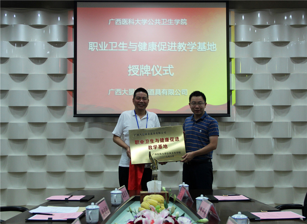 在南宁市安监局积极推动下,首个“职业卫生与健康促进教学基地”,6月28日,在广西华辉集团旗下公司——广西大景商业道具有限公司正式挂牌成立。据悉,这也是广西首个校企合作职业卫生与健康促进教学基地。该教学基地由广西医科大学公共卫生学院与广西大景商业道具有限公司合作成立,旨在建立一个公共卫生专业人才培养、实践和科研的平台。