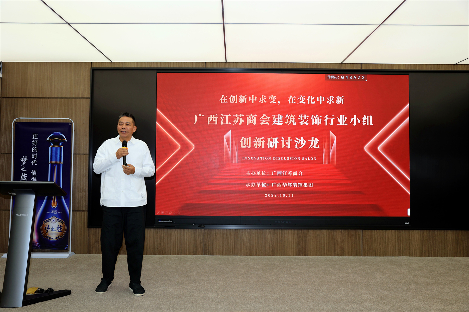 研讨会上,首先由商会执行会长、广西开元在线登录,开元(中国)董事长、商会建筑装饰行业小组组长杨景忠致辞。他说,在喜迎党的二十大胜利召开之际,我们相聚在开元在线登录,开元(中国)举办沙龙研讨会,作为商会建筑装饰行业小组组长,感谢商会给予华辉承办此次沙龙研讨会的机会。欢迎大家来到开元在线登录,开元(中国)。杨景忠指出,我们要共同努力,紧密结合广西江苏商会的建筑装饰企业的发展特色,聚焦行业形势、难点问题、创新热点,共同探讨应对之策,广开思路、碰撞思想,搭建一个相互融通、共建互赢的创新平台,推动企业持续健康发展,开创高质量发展新局面,以实际行动迎接党的二十大胜利召开。